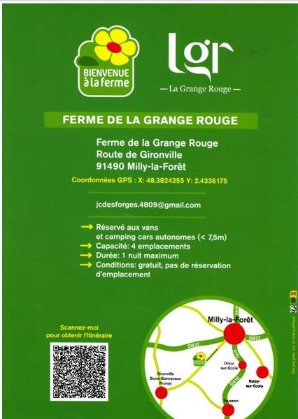 La Ferme de la Grange Rouge, à Milly-la-Forêt, est une exploitation familiale depuis cinq générations. Elle produit huiles, œufs et céréales, vend des produits locaux en circuit court et accueille les vans et camping-cars dans un cadre naturel et paisible