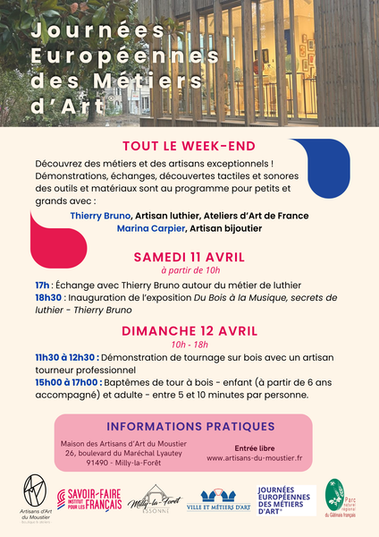 Week-end dédié aux métiers d’art à Milly-la-Forêt avec démonstrations, échanges et animations autour de l’artisanat les 11 et 12 avril à la Maison des Artisans d’Art du Moustier. Entrée libre.