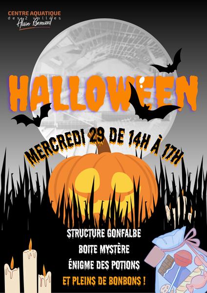 Après-midi ludique et effrayante pour les enfants au centre aquatique le 23 octobre, avec jeux, énigmes et bonbons.