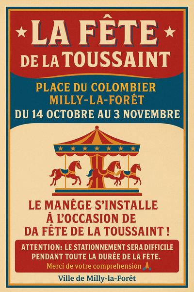 Manège installé à Milly-la-Forêt du 14 octobre au 3 novembre pour célébrer la Toussaint dans une ambiance familiale.